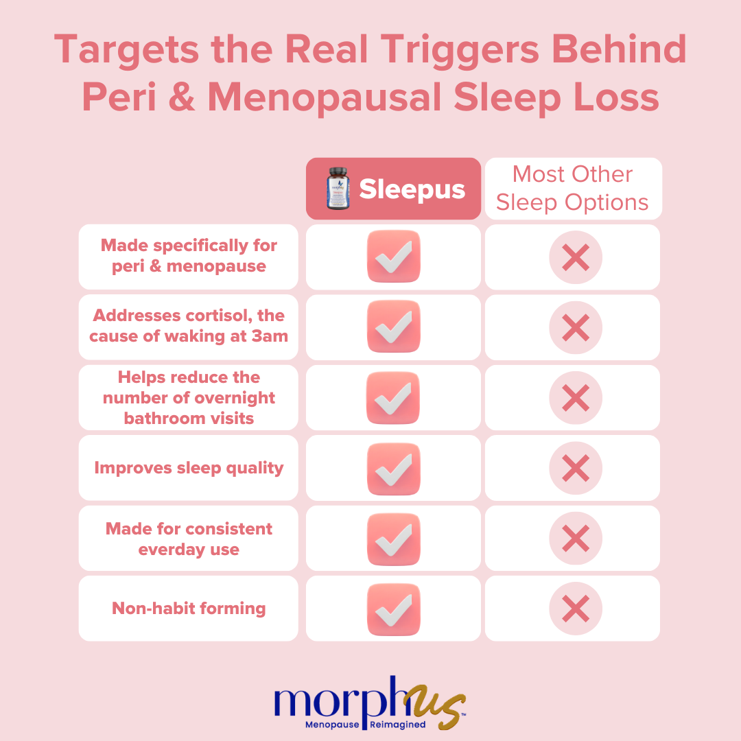 During perimenopause and menopause, sleep often falls apart first, and everything else follows. Our non-habit-forming Sleepus formula helps you fall asleep faster, stay asleep longer, and wake up actually refreshed. Because menopause should be full of good mornings.